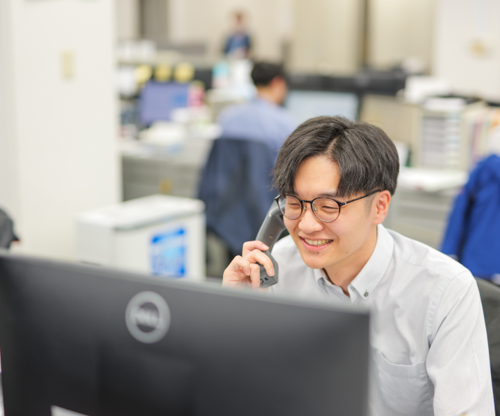 私は内勤の営業事務職として、主にお客様の電話応対と商品の受発注を行っています。一見、一連の流れが決まっているので退屈そうに思ったり、単純そうに見えるかもしれませんが、実はかなり奥が深く、物流と営業、仕入先と得意先など、あらゆる方面で仕事の橋渡しをする役目があります。時には仕入先から見積もりを貰って、得意先と打合せをする事もあり、内勤ながらも多くの人と関わるお仕事です。